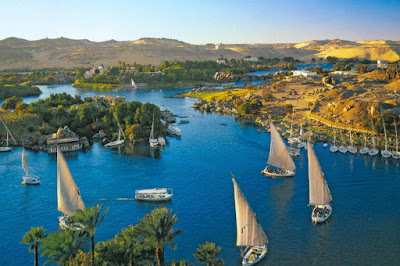 As imagens mostram o rio Nilo em Assuão, com as típicas felucas,