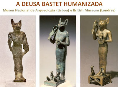 a deusa Bastet humanizada (com estatuetas de bronze pertencentes